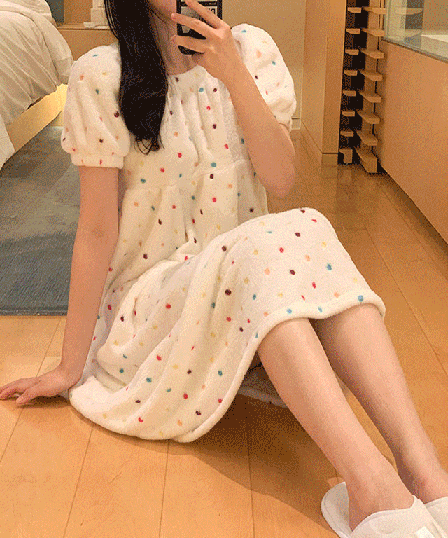 [포근,따뜻🔥] 캔디 팝핑 땡땡이 도트 오프숄더 극세사 헤어 밴드 세트 잠옷 수면 원피스