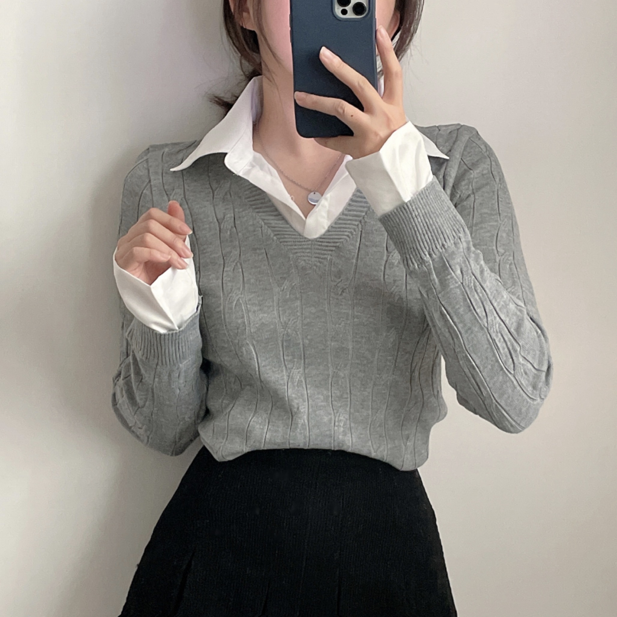 날씬핏, 셔츠 레이어드 꽈배기 브이넥 니트 /일체형 3color