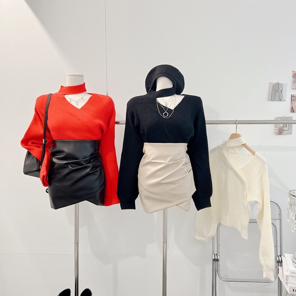 [예쁨한도초과~/연말룩!] 메리 크롭 랩 오프숄더 트임 초커 니트 [3color]