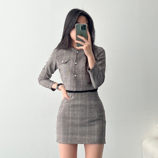 [가격실화?/키작녀추천!!] 체크 트위드 크롭자켓+트위드 치마 투피스 세트