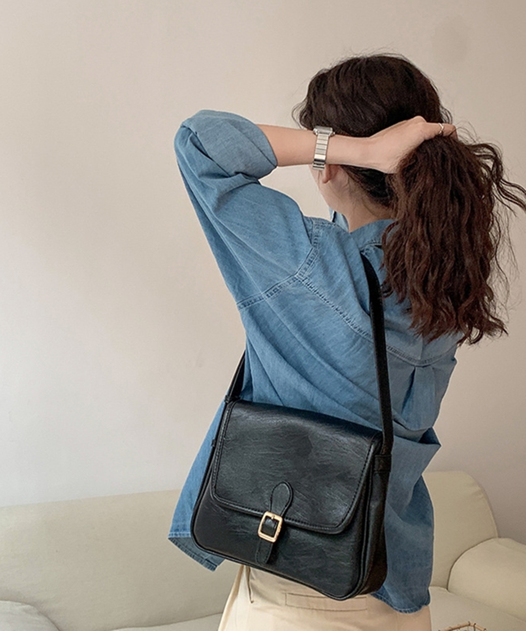 베이직 크랙 비건 레더 버클 스퀘어 메신저백 숄더백 가방 블랙 브라운 아이보리