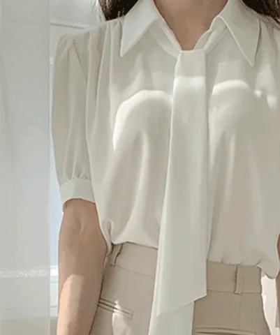 [🚀당일✌끈 탈착] 셔링 드레시 타이 반팔 블라우스 , 단독 자체제작 카라넥 카라 결혼식 하객룩 면접 리본 오피스룩 실키 봄 여름 브이넥 넥타이 셔츠 남방 스카프 화이트 하늘색