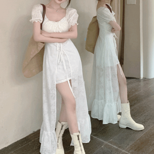 (L 당일발송) [여름신상/여름원피스] 청순 스퀘어넥 퍼프 반팔 리본 플라워 언발 미니 롱원피스 바캉스룩 비치룩 비치원피스 휴양지룩 여행 휴가 파티룩 파티드레스 유니크