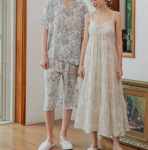 힐트니 커플 잠옷 트왈드주이 민소매 캡내장 원피스 여름 신혼 허니문 파자마