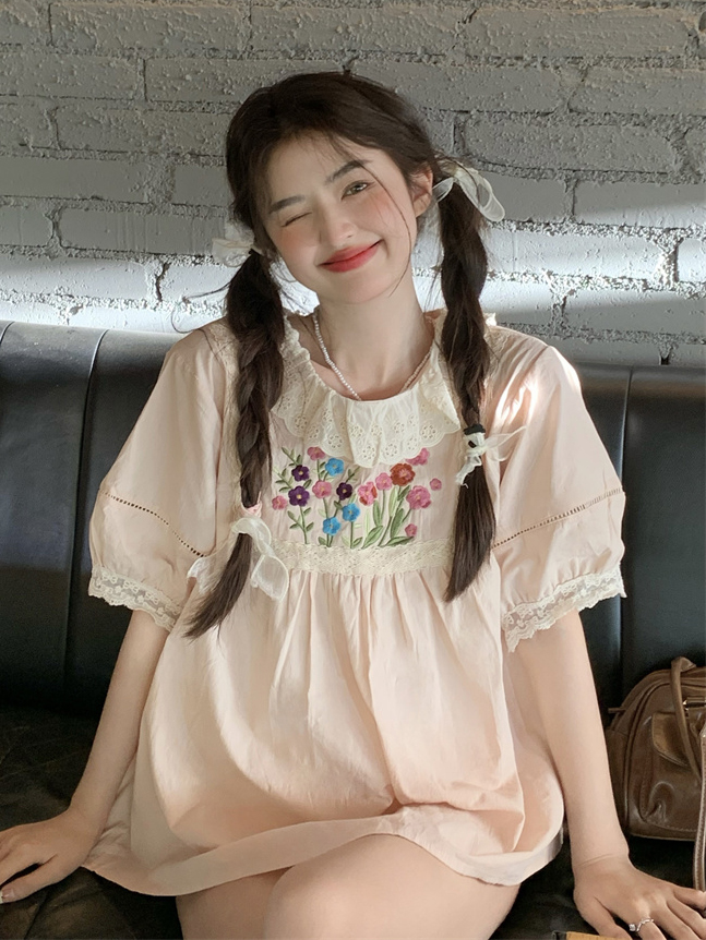 [화이트당일출고] 프론트 플라워 자수 레이스 넥 퍼프 블라우스-2컬러
