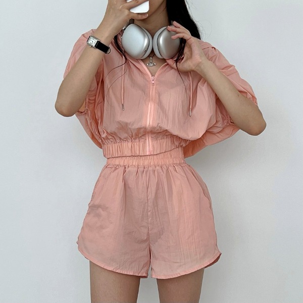 [여름바람막이/반팔후드집업]라이트 바스락 크롭 반팔 후드집업 + 하이웨스트 숏 팬츠 트레이닝 투피스 세트 4color
