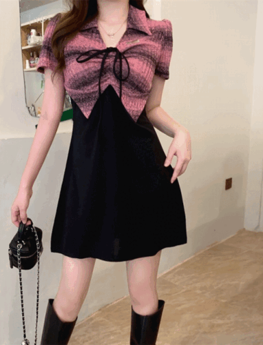 당일출고 핑크 나염 반팔 카라 셔츠 반전 미니원피스 페이크투피스 빅사이즈 77 88 A 라인 셔츠원피스 크롭티 브이넥 리본 셔링 스트랩 독특한 여름 코디