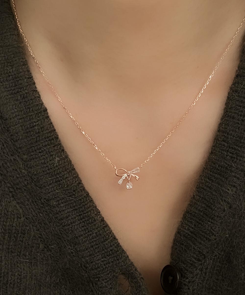 [무배] 실버925 테파 리본 물방울큐빅 드롭 목걸이 (실버 로즈골드)