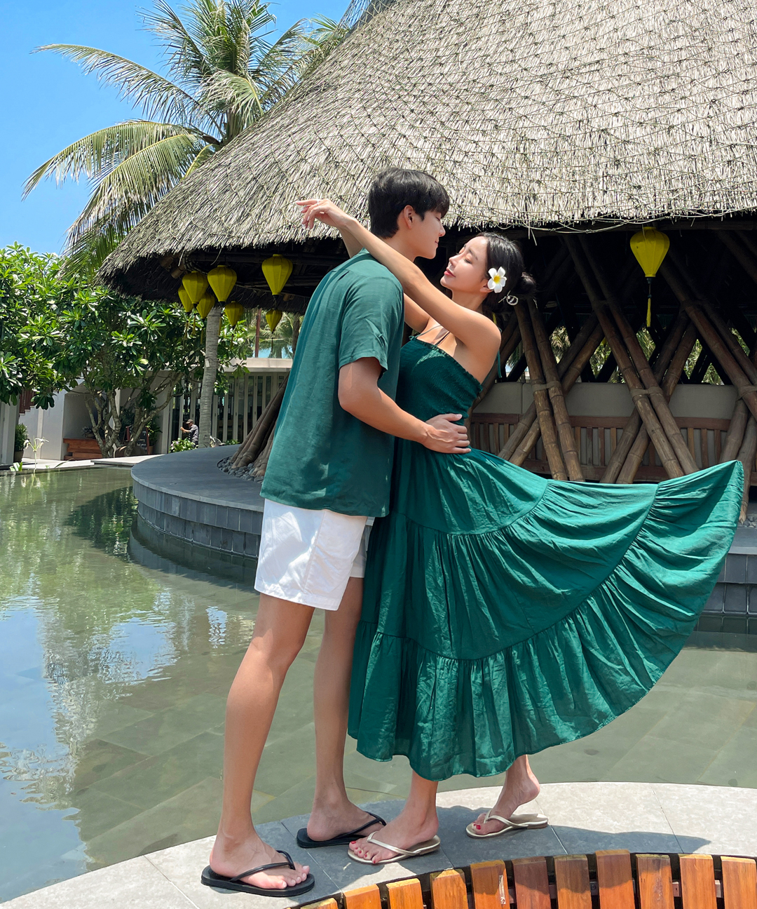 [MADE BY 비바럽]썸머 왈츠 허니문 시밀러 커플룩[롱/원피스/스모크/밴딩/캉캉/플레어/리본/그린/여름/휴양지/바캉스/커플룩/시밀러/휴가/허니문/신혼여행] OP19764F