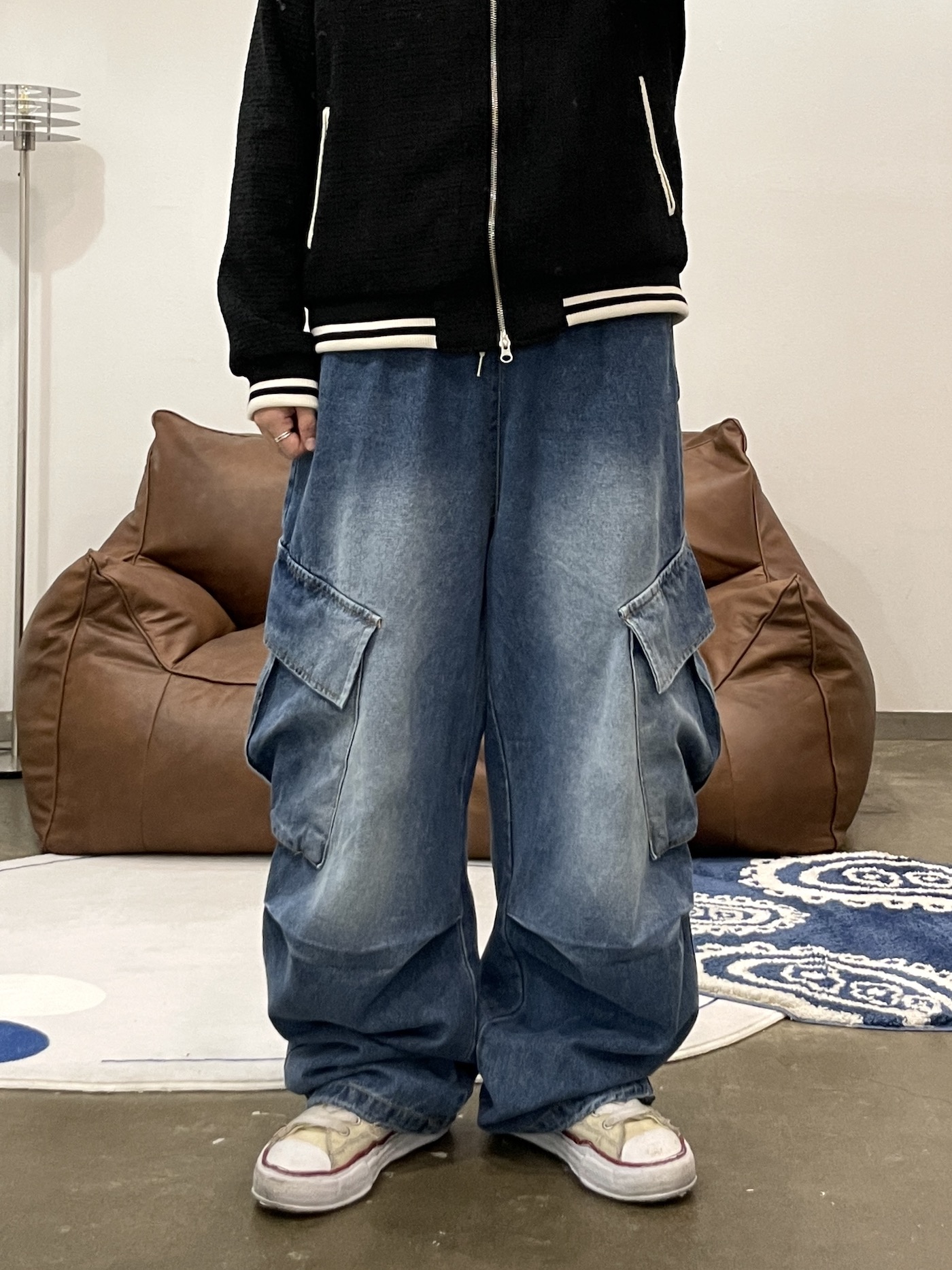 [누적 1000장](2COLOR) 사선벌룬 데님카고팬츠 (카고, 벌룬팬츠, 청카고, 와이드청바지, 카고청바지, 스트링팬츠, 카고바지)