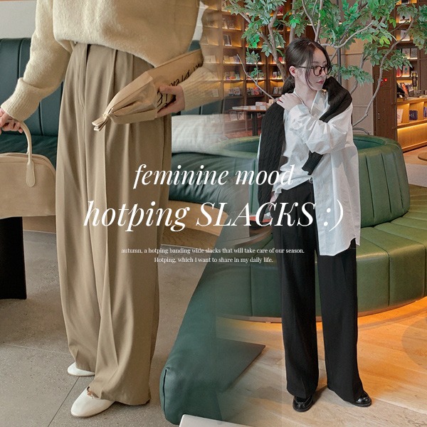 에떼 뒷밴딩 투핀턱 와이드 슬랙스(25~34) (가을-신상-가을슬랙스-가을코디-롱슬랙스-여자슬랙스-빅사이즈슬랙스-밴딩슬랙스-칼주름슬랙스-출근룩-가을하객룩)