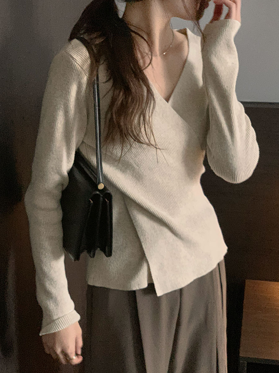 로즈니 울 브이넥 슬림 랩 골지 니트 4color