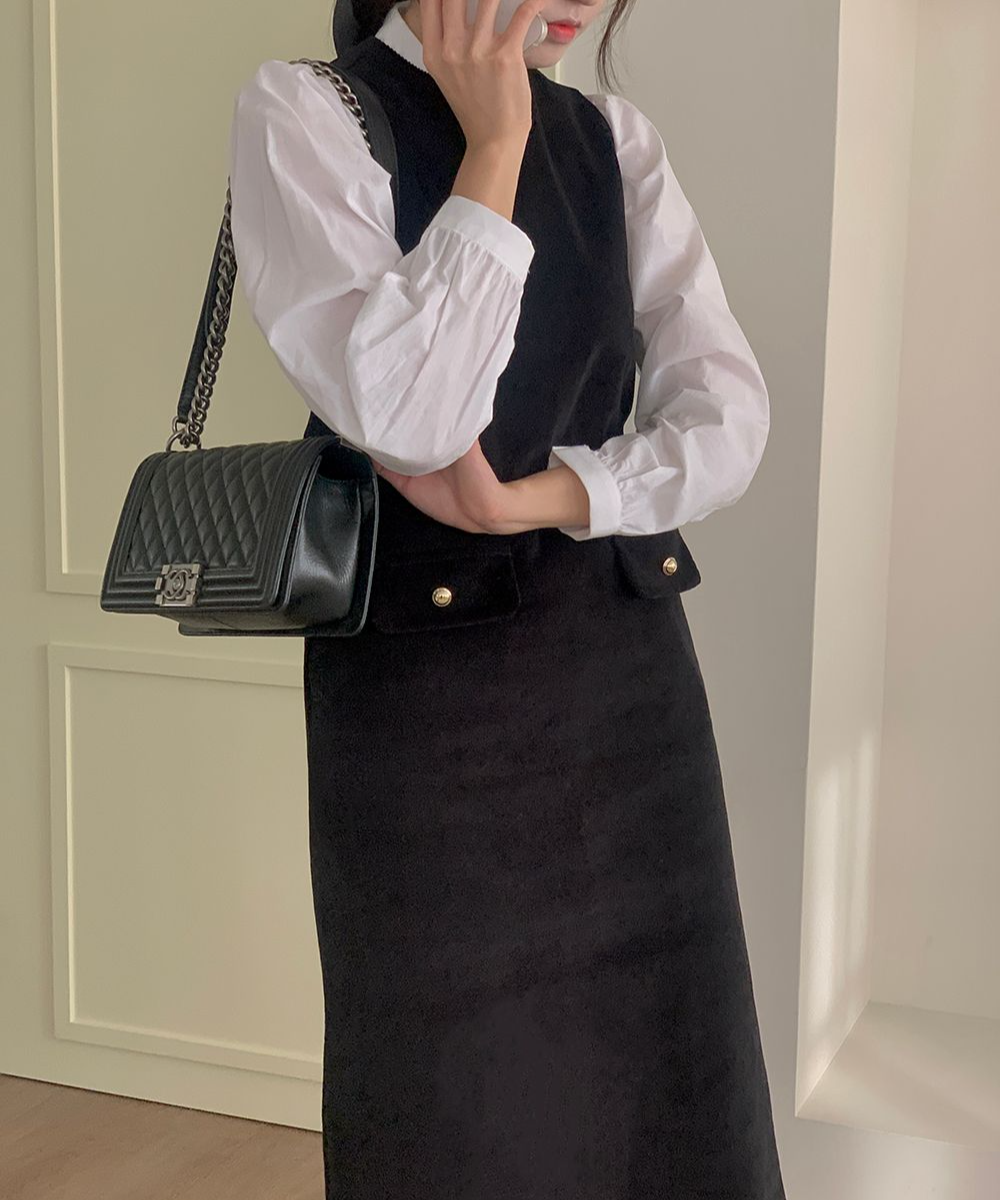[국내/고퀄리티]베로나 코듀로이 골드 버튼 나시 뷔스티에 하객 원피스