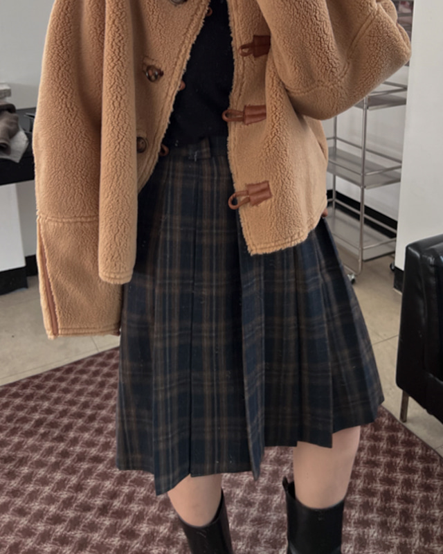체크 플리츠 미디 스커트 ( 차콜 네이비 )