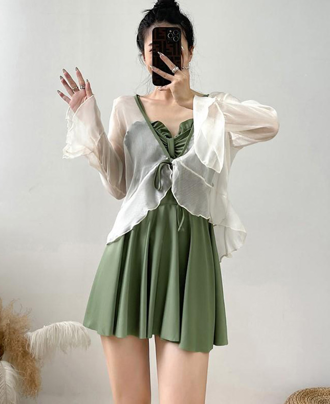 체형보완 빅사이즈 셔링 원피스 수영복+시스루 가디건 세트