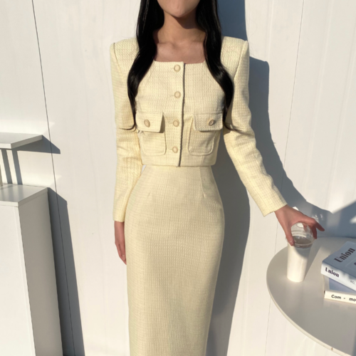 데빈 트위드 자켓 롱 스커트 셋업 ( 숏 크롭 롱 미디 하이웨스트 하객룩 결혼식 예복 세트 투피스 )