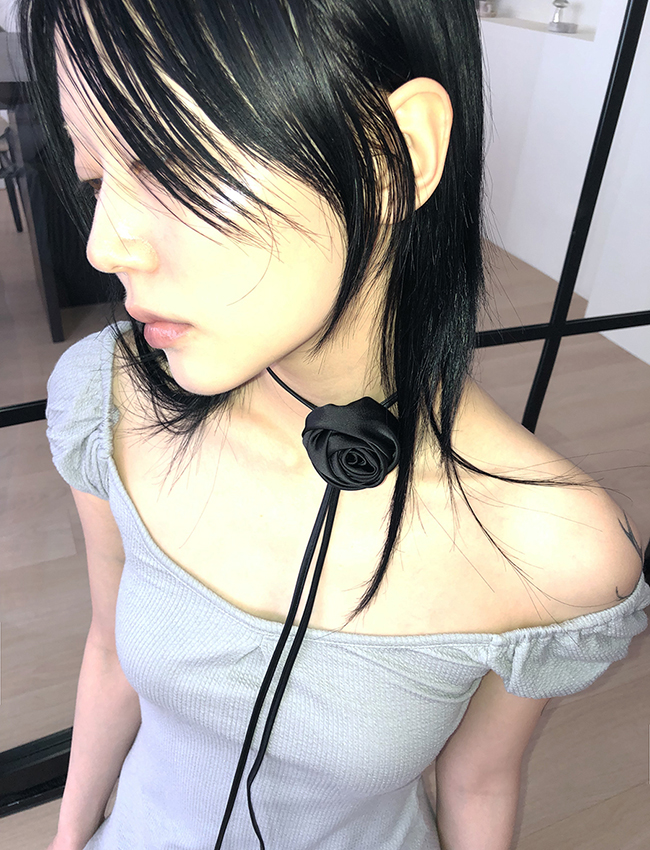 메이 블랙 새틴 로즈 롱스트랩 초커