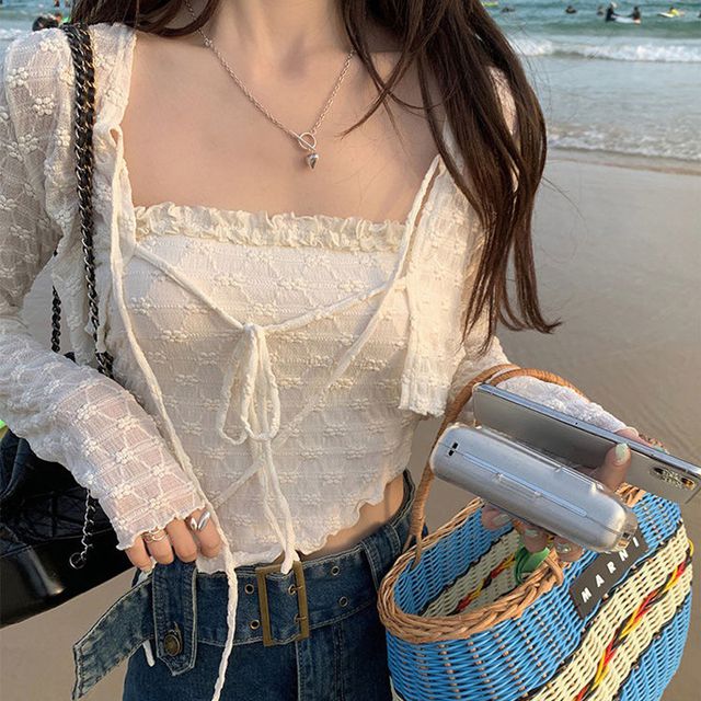 (당일출고/set) 레이스 꽃 프릴 시스루 크롭 언발 끈나시 볼레로 썸머 여름 가디건 투피스 세트 휴가룩 바캉스룩 휴양지룩 페스티벌룩