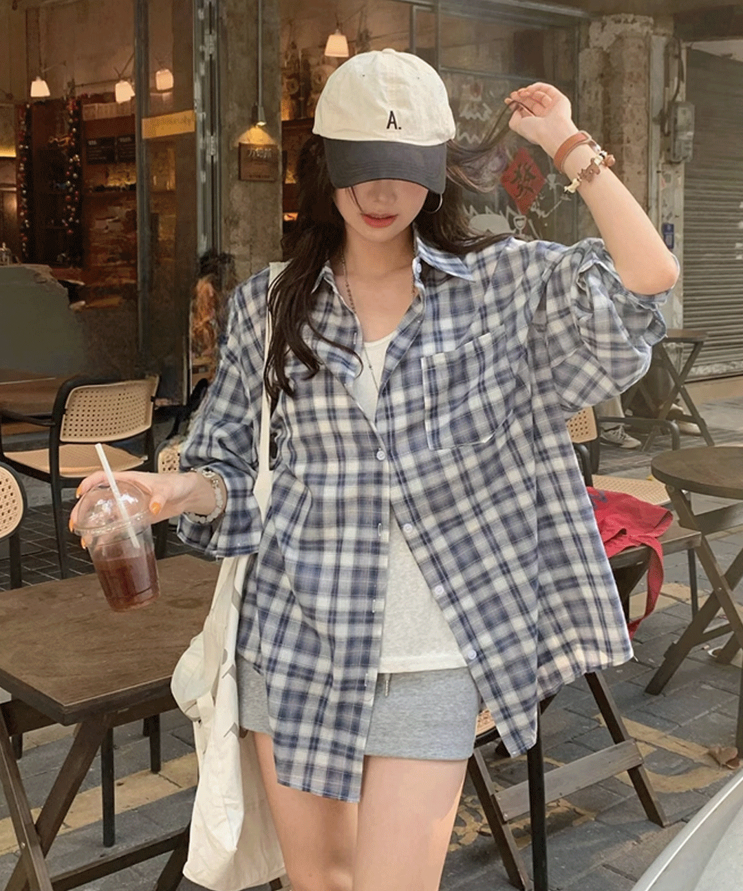[💗빈티지 블루/루즈핏/체형커버🌺자외선차단/가방속 필수템🚛무료배송] 제롬 루즈핏 체크 셔츠 s160124