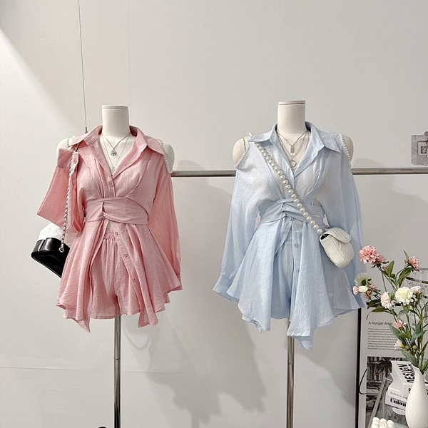 [셔츠+반바지set!/페미닌!] 겨울 오벨 진주 어깨 트임 투웨이 쉬폰 실키 새틴 벨트 스트랩 벌룬 퍼프 긴팔 셔츠 카라 블라우스 밴딩 와이드 반바지 숏팬츠 투피스 세트 [4color]