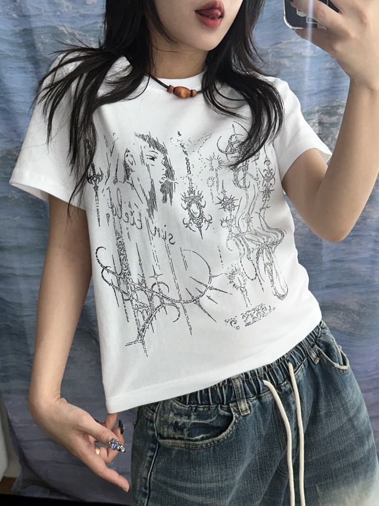 y2k 걸즈 애니 포인트 더 힙 세미 크롭 하프 티셔츠(3color)