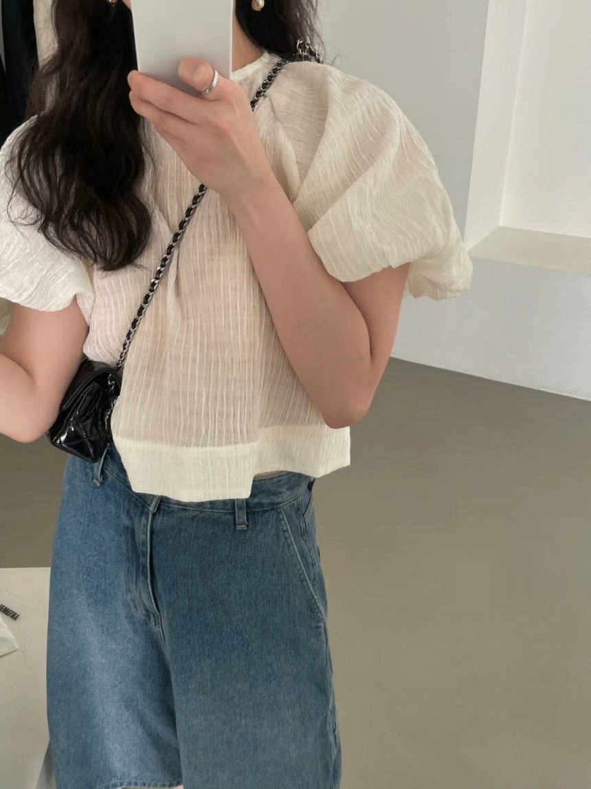 (당일발송) basket 바스켓 슈가 블라우스 시스루 소매 퍼프 크롭 블라우스 bl (3col)