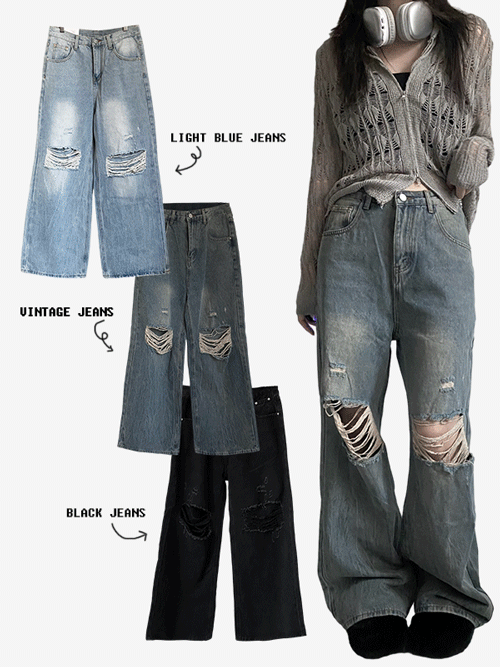 [S-XL]레트로 데미지 빈티지 구제 데님 찢청 통와이드 골반라인 팬츠