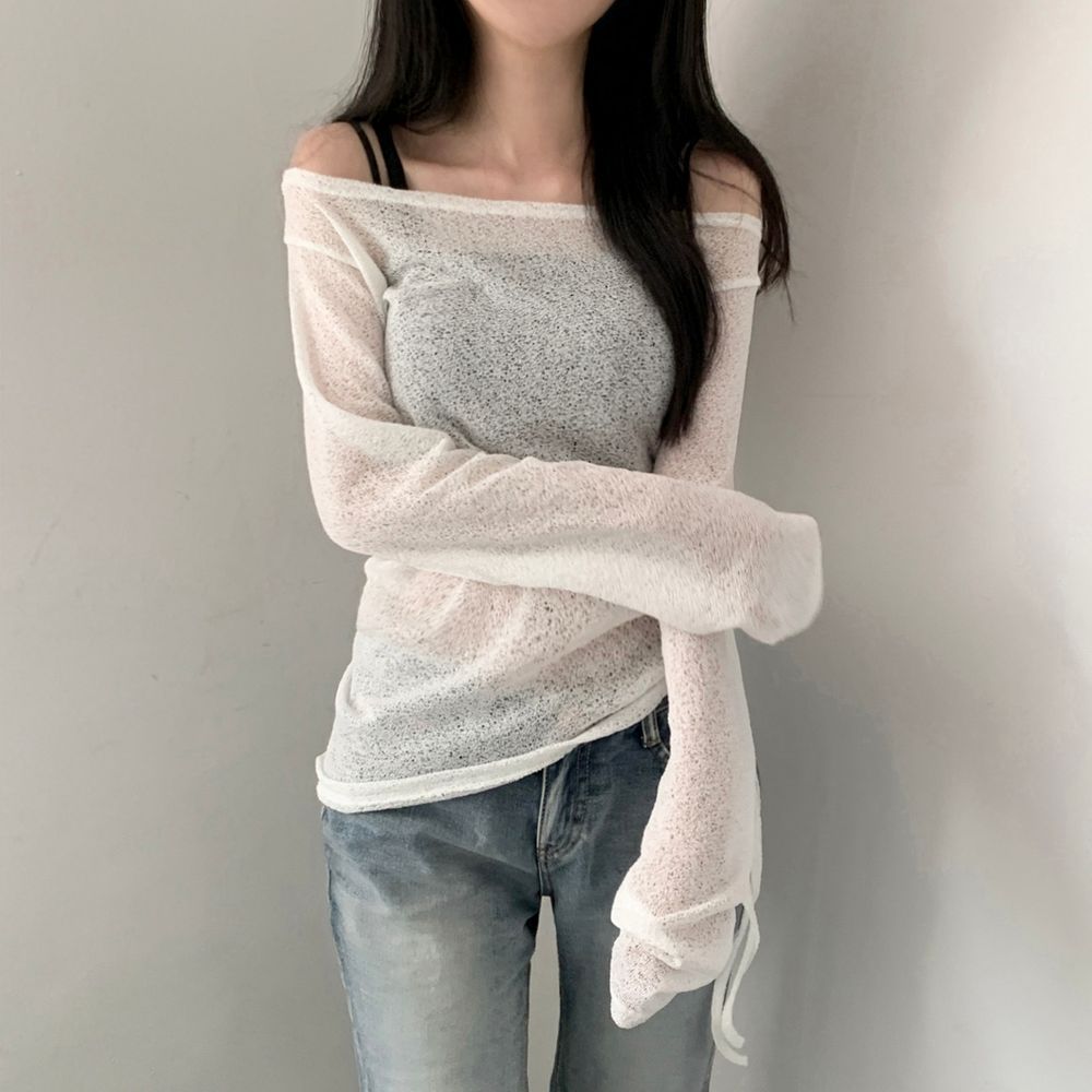 [사이즈추가/여름니트] 메이 오프 스트링 시스루 오프숄더 여름니트 루즈핏 여름긴팔니트