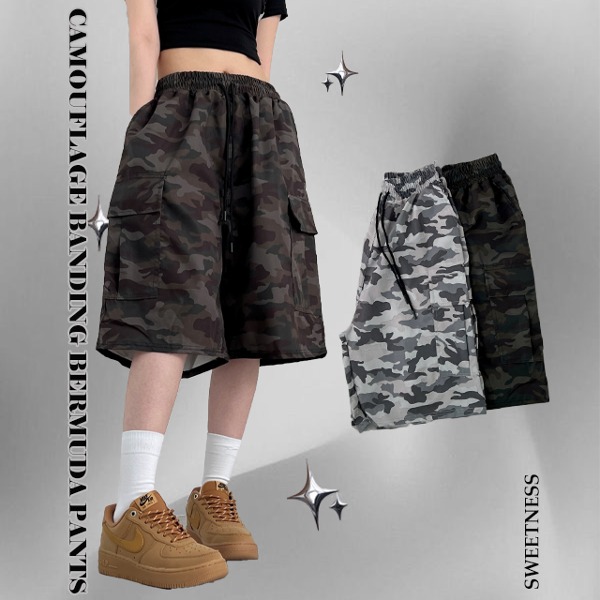 1+1할인 [힙무드/완전편해] 카모플라주 패턴 카고 5부 밴딩 버뮤다 숏팬츠
