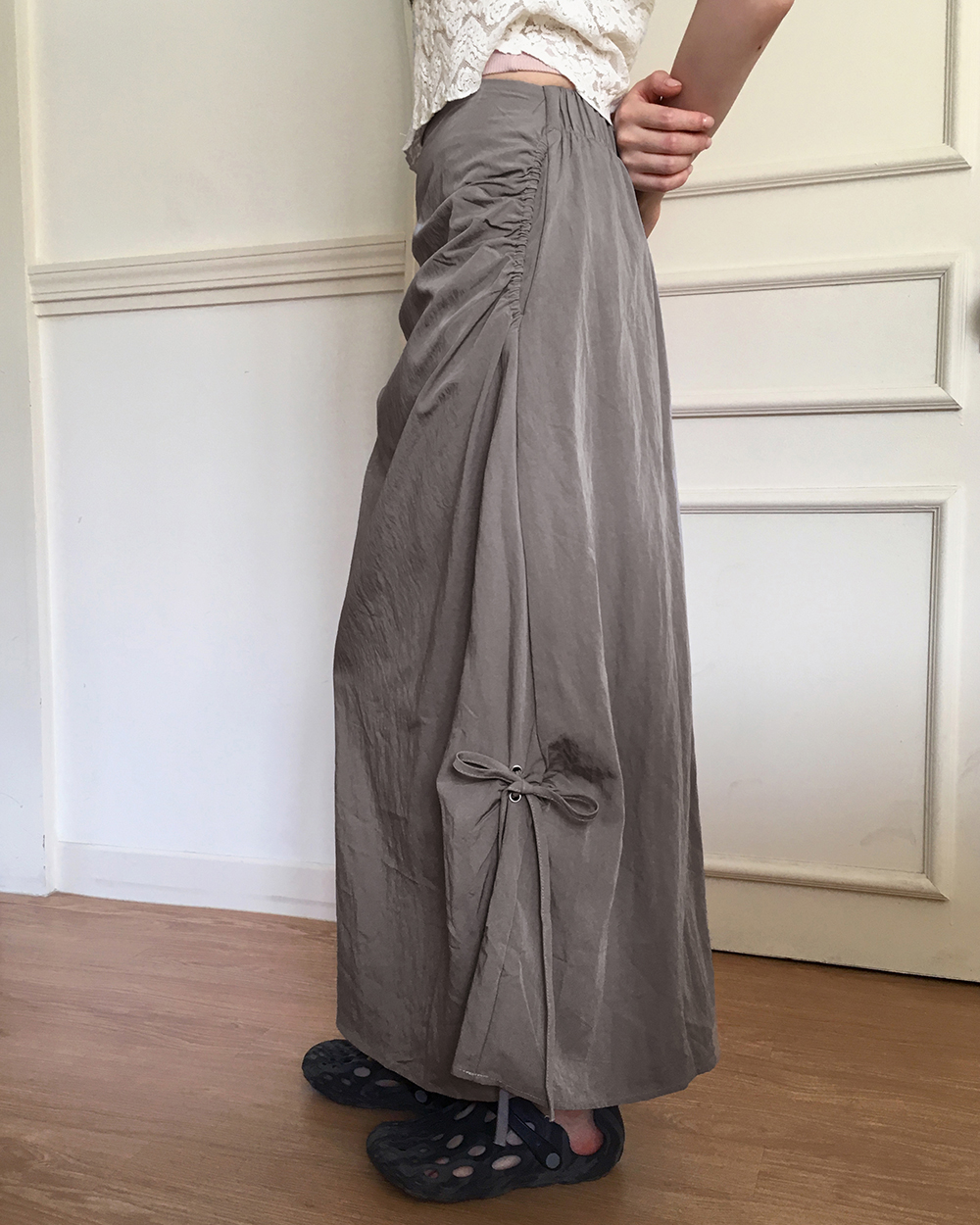 [MADE] 키쉬 아일렛 리본 셔링 포켓 나일론 롱 스커트