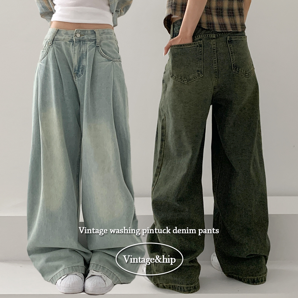 [*사계절데님👖/핏보장🖤] *흔하지 않은 워싱* 몰리 탄탄핏 빈티지 투 핀턱 롱 와이드 데님 팬츠 청바지 - 3color