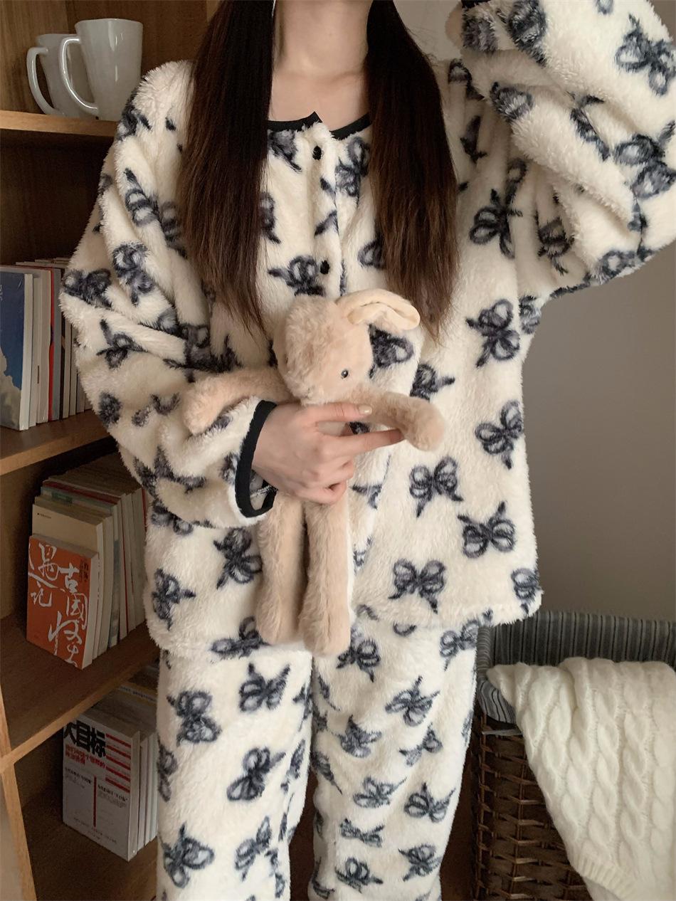 (수면잠옷) (예트잠옷세트) 극세사 잠옷 여성 파자마 빅사이즈 겨울 라운드넥 리본 투피스