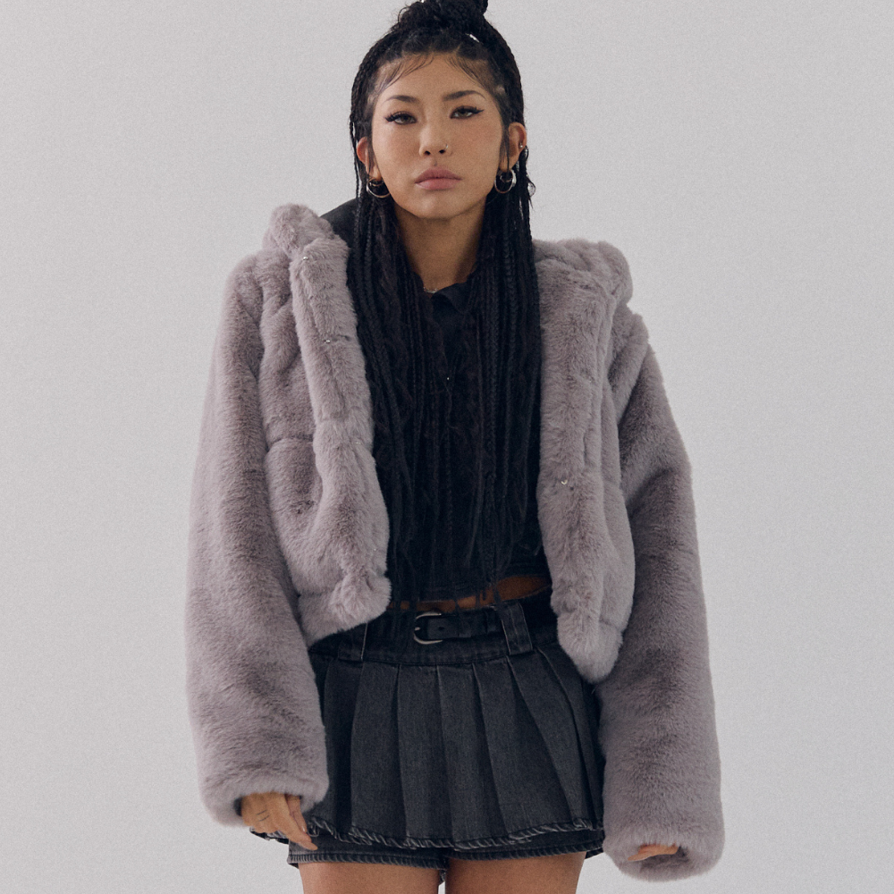에코퍼 페이크퍼 파티룩 후드크롭자켓 연말룩 후드숏코트 퍼자켓 (4color) [크리스마스,연말룩,파티룩,에코퍼,후드퍼자켓,노카라퍼자켓]
