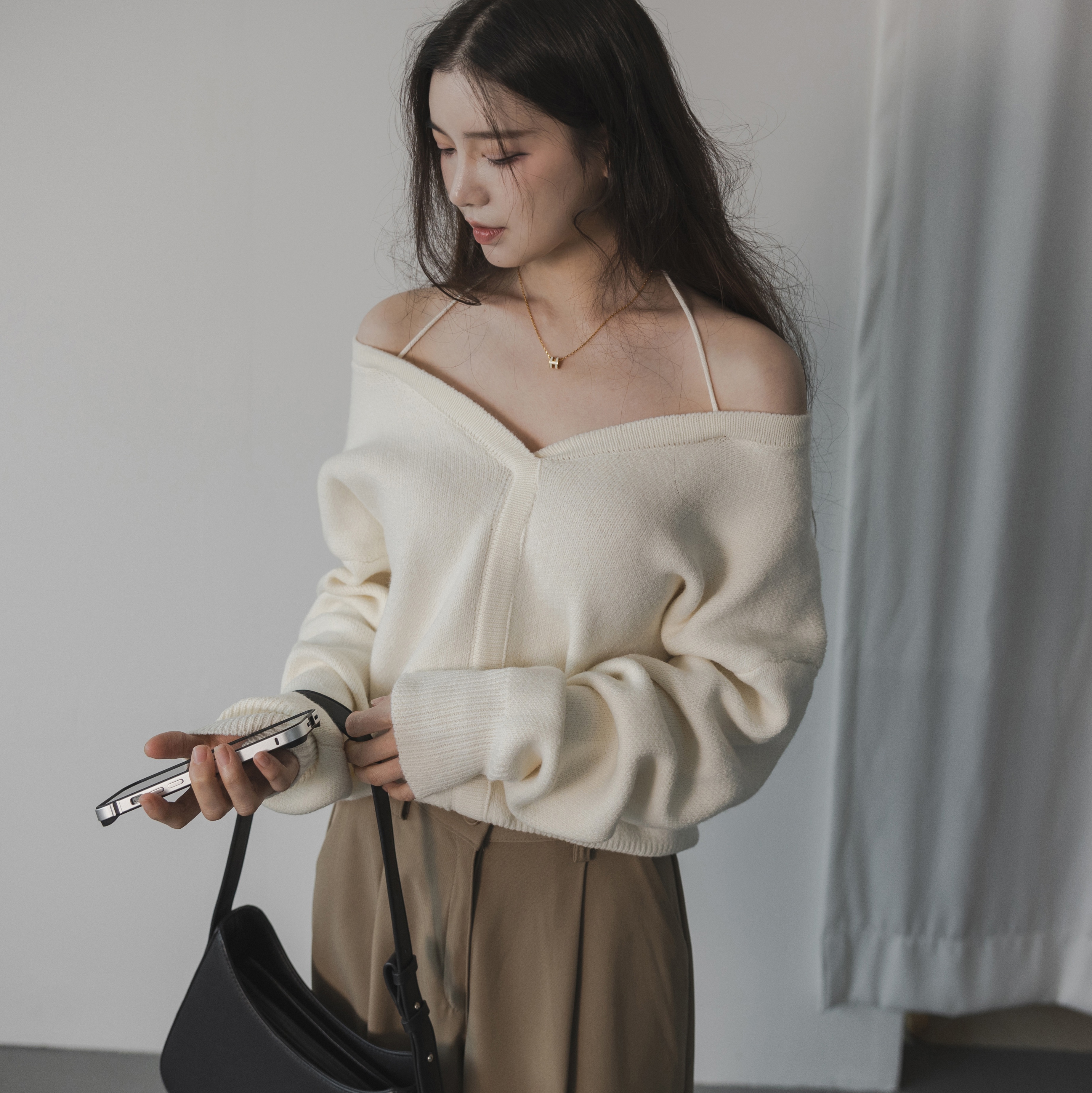 머쩍 봄 가을 겨울 브이넥 오프숄더 니트 긴팔 티셔츠 레이어드 빅사이즈 데일리룩 블랙 아이보리 그레이