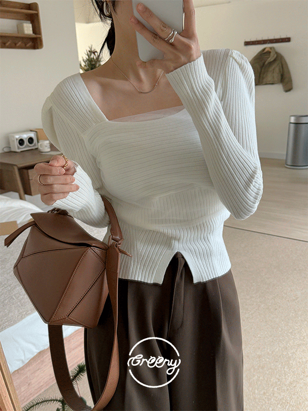 라우라 셔링 레이어드 스퀘어넥 퍼프 니트 블라우스 (3 colors)