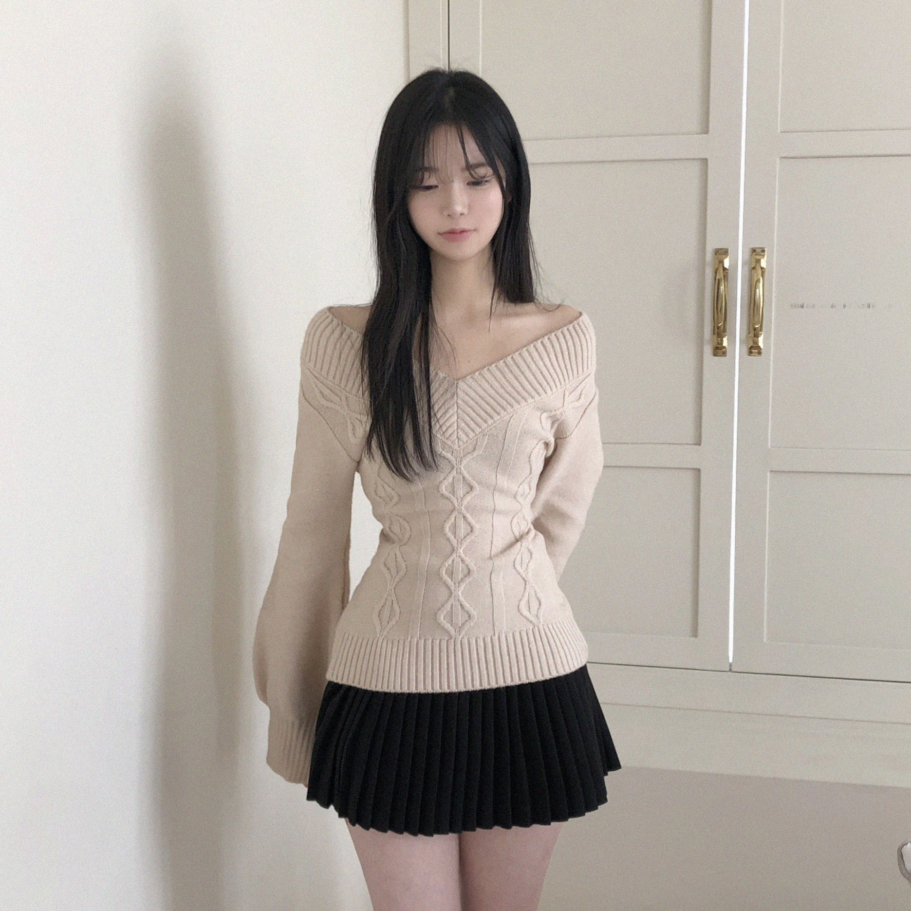 [완전날씬핏]브이넥 오프숄더 꽈배기 긴팔 니트