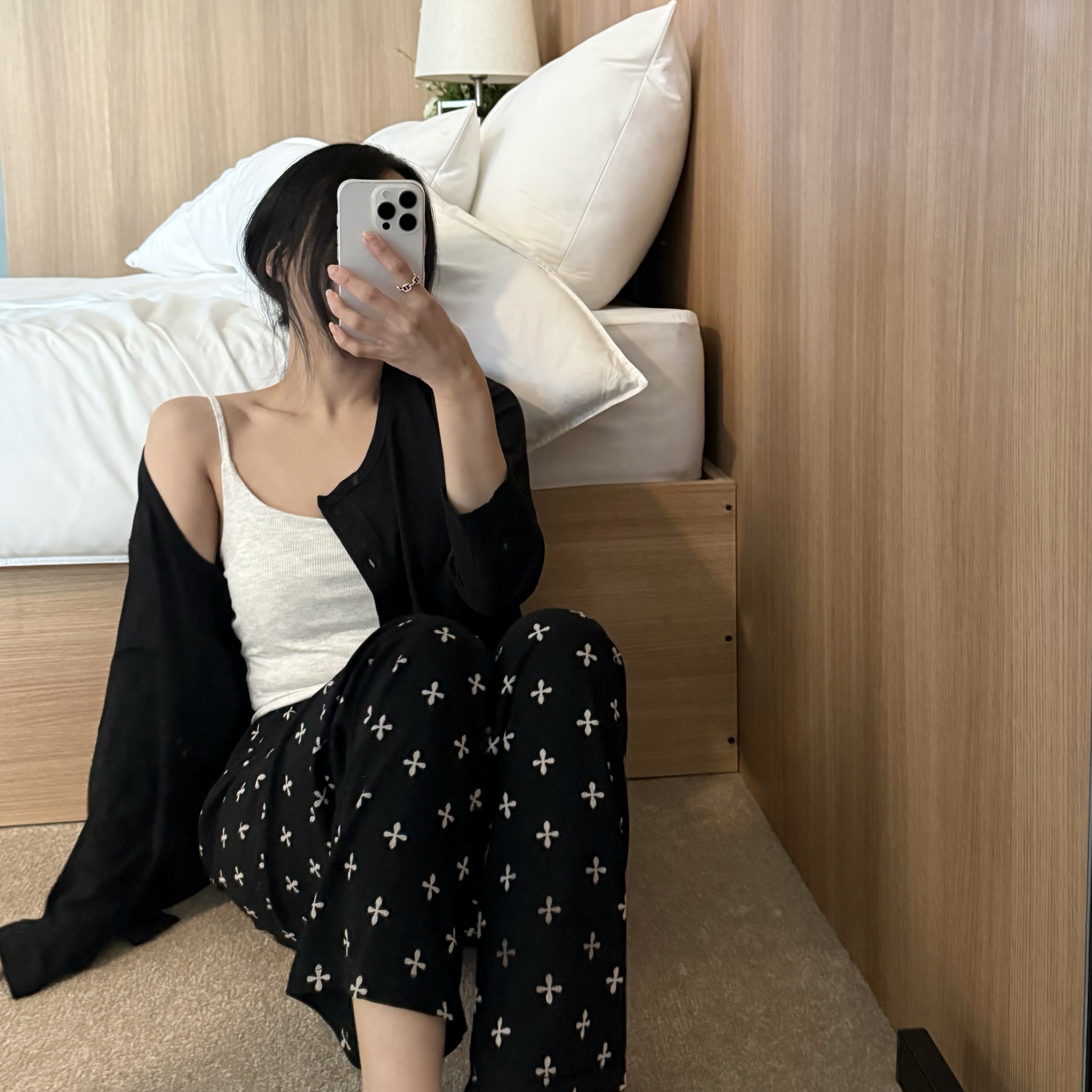 [캡내장]가디건+상의+긴바지 멜란지 블랙 3pcs 잠옷 홈웨어 세트