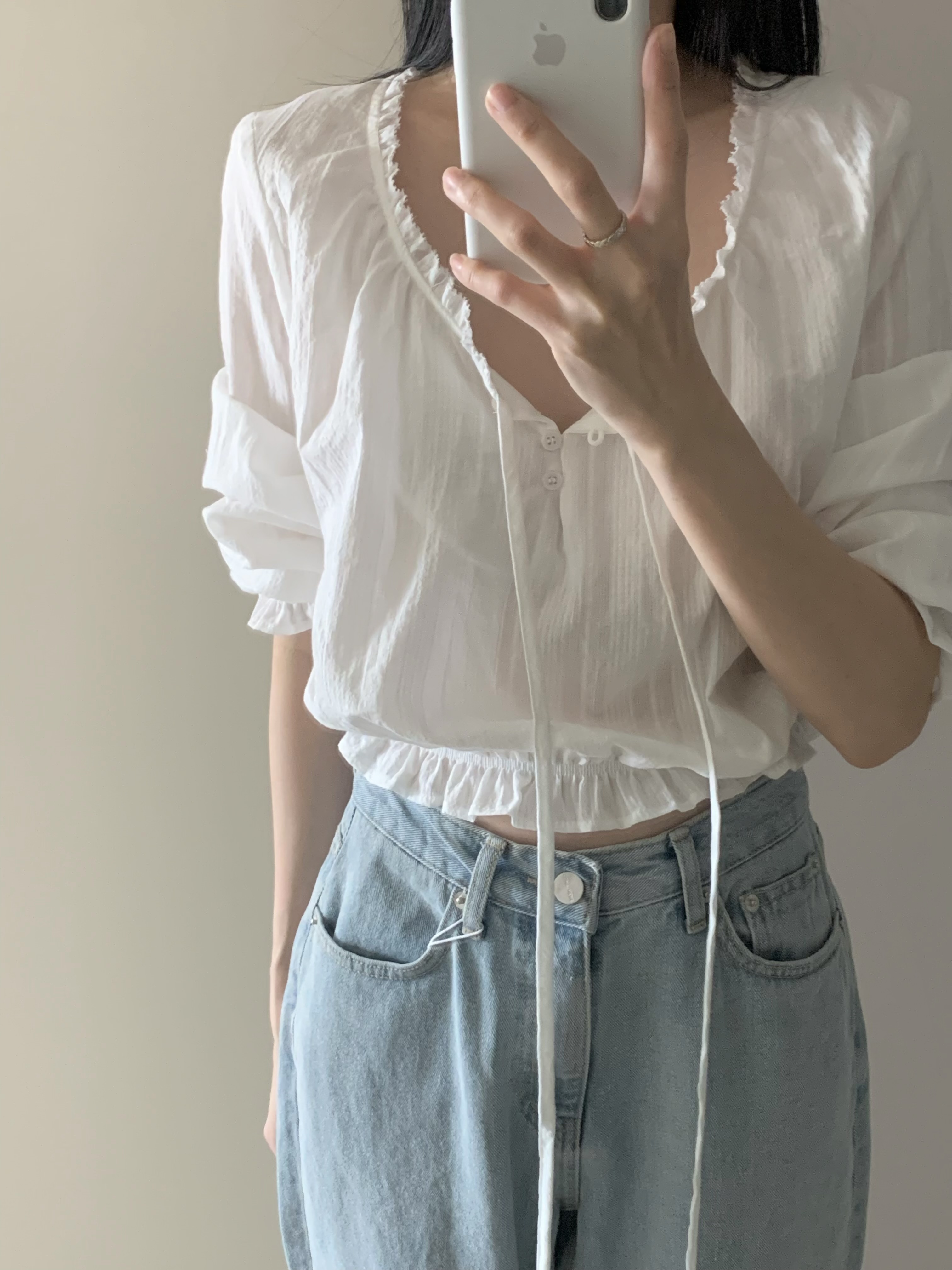 퍼피 끈 블라우스, 여자 레이스 세미크롭 블라우스