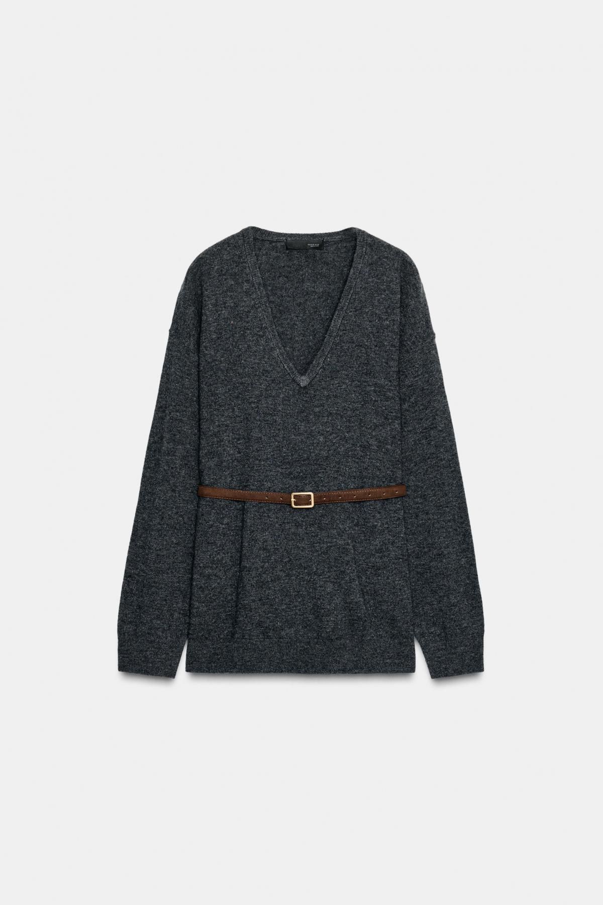 자라 오버사이즈 100 울 브이넥 벨트 니트 스웨터 9598/162 GREY