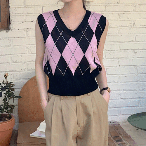 [가을신상/가을니트]브이넥 아가일 크롭 조끼 베스트 민소매 4컬러 체크 니트 다이아 봄 가을 레이어드 자켓 캠퍼스룩 데일리룩 숏 티셔츠