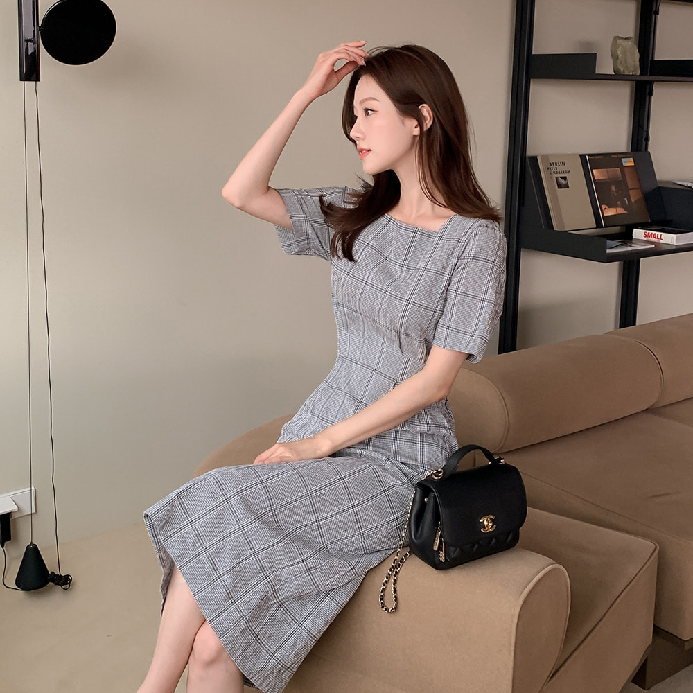 엘린 체크 스퀘어넥 리본 스트랩 반팔 H라인 슬릿 롱 원피스