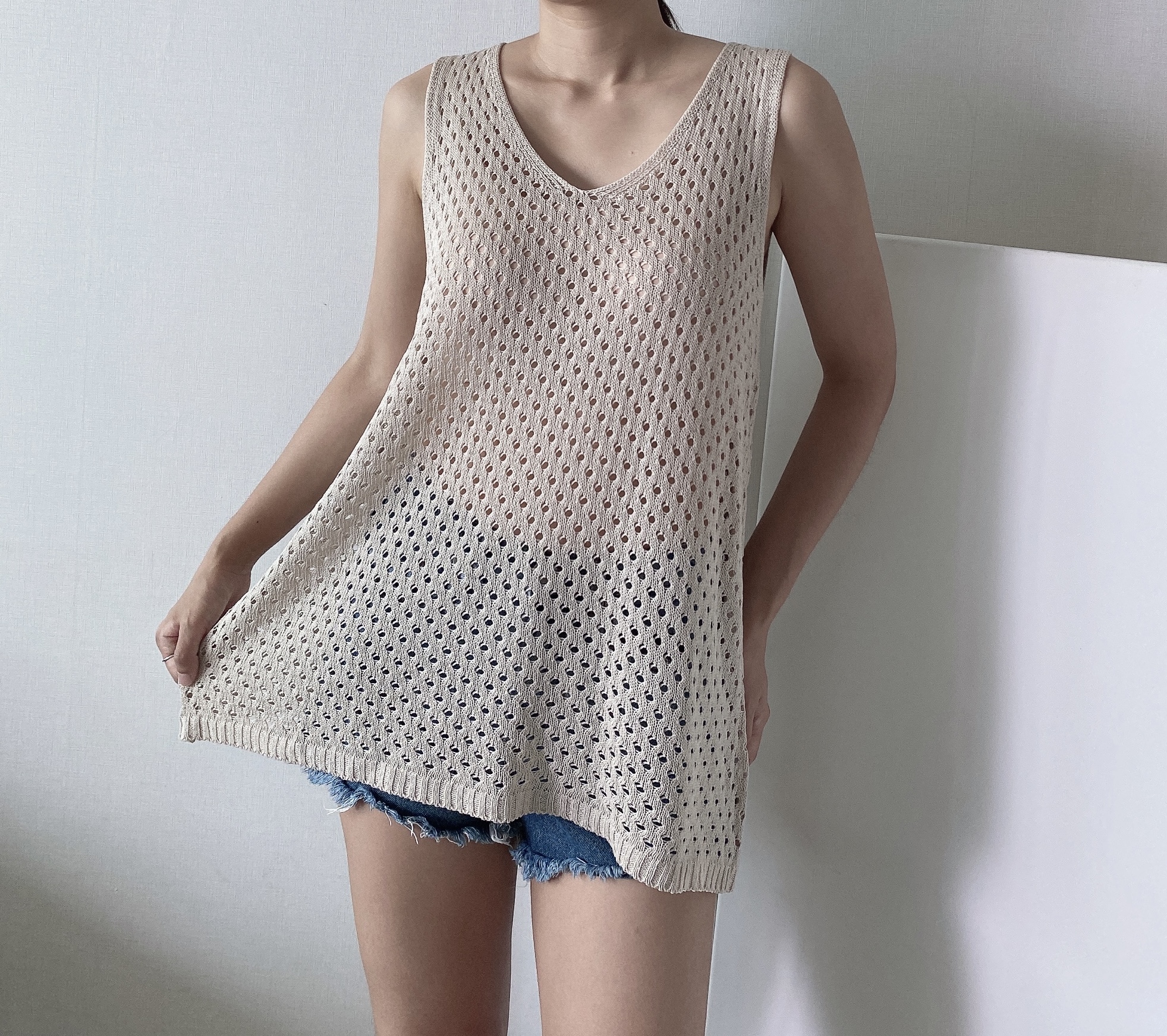 [55-100/뱃살커버] 구멍 시스루 니트 조끼 (수영복 레이어드 나시 빅사이즈 카키 블루 베이지 블랙 66 77 88 99)