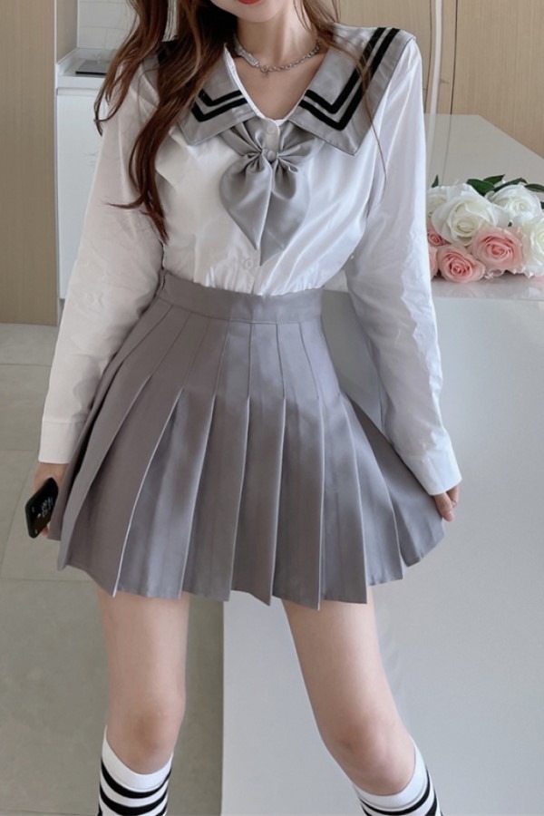 set 세일러문 카라 리본 타이 긴소매 롱슬리브 블라우스 탑 플리츠 미니 스커트 투피스 세트