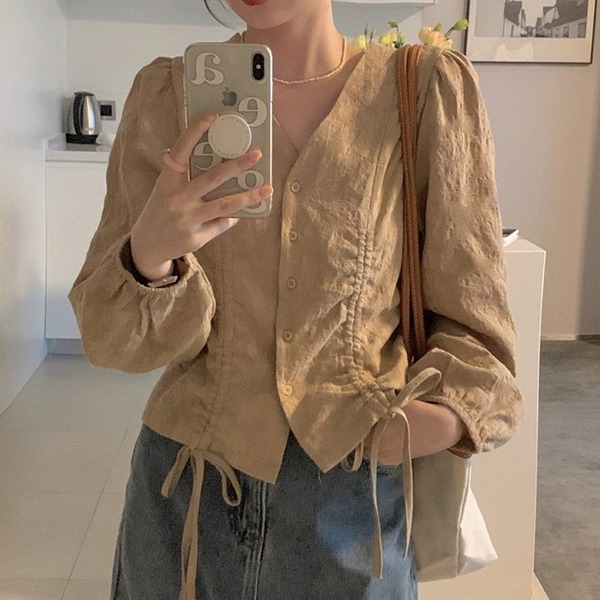 (빠른출발) 민선 노카라 브이넥 셔링 크롭블라우스