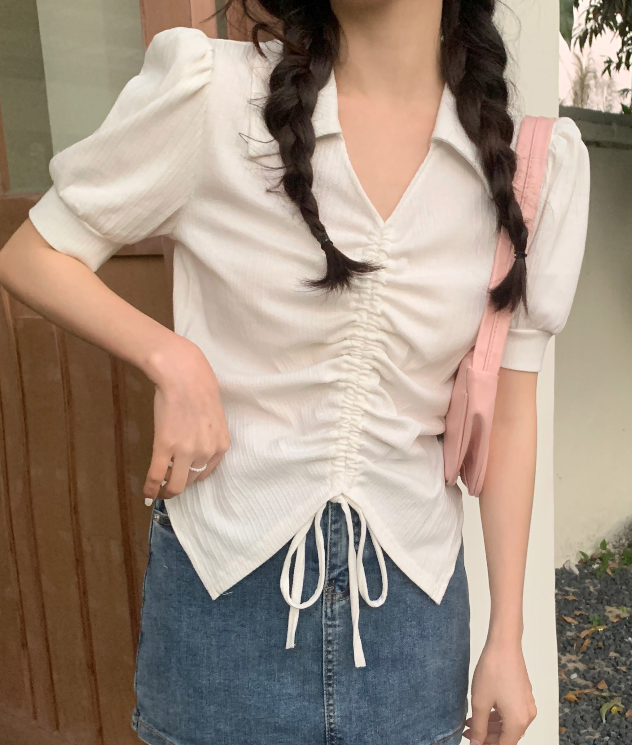 공항패션 공항룩 하객룩 브이넥 셔링 스트링 퍼프 여름 반팔 블라우스