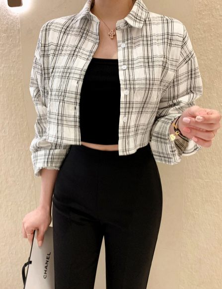 퍼퓸 뒷 트임 (절개 남방 셔츠 체크 크롭 캐주얼 포인트 신상) - 화이트, 블랙, 카키