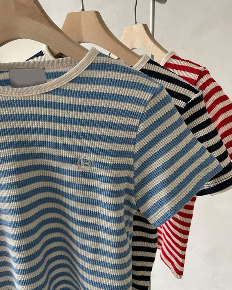 B로고 자수 와플 스트라이프 티셔츠 3color
