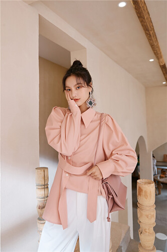 핑크 코랄 언발런스 벨트 빅카라 어깨 셔링 블라우스