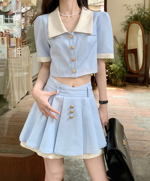 반팔 크롭 상의+하이웨스트 플리츠 스커트 세트