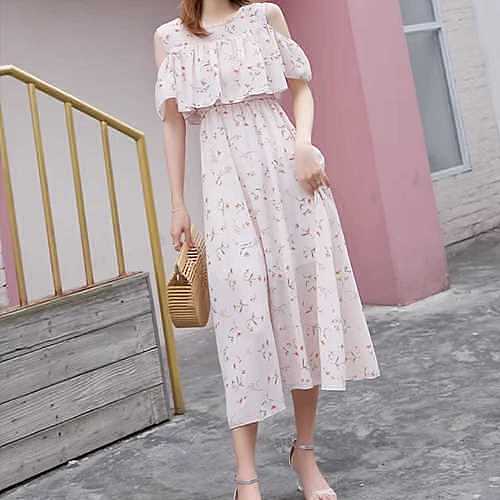 핑크 꽃무늬 심플 어깨 트임 하이웨스트 롱 원피스 J03